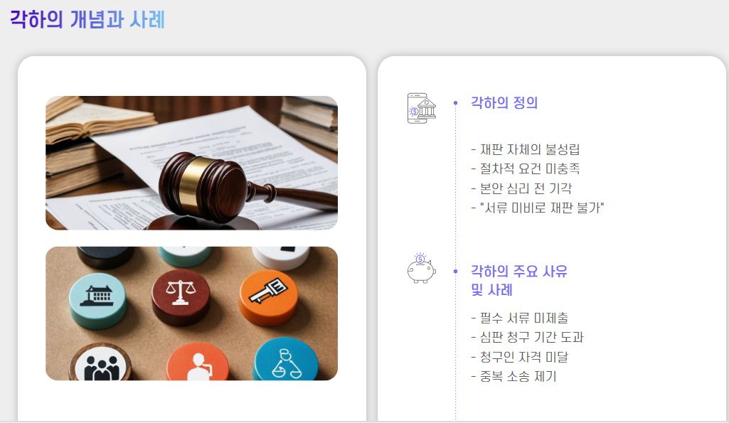 | 각하 | 절차상 문제로 재판 자체 기각 | 사건 아예 성립 불가 | 서류 미비, 중복 소송 |