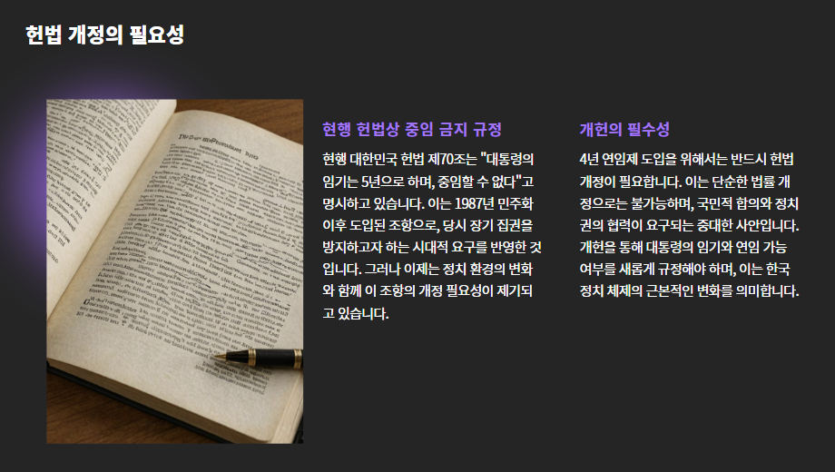 따라서 4년 연임제로 바꾸기 위해선 헌법 개정이 필수입니다.
