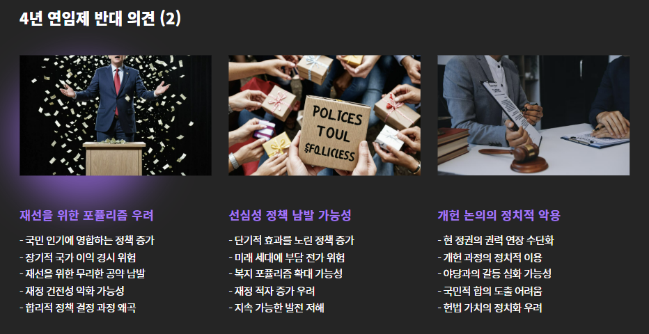 - 대통령이 연임을 위해 단기 성과 중심의 선심성 정책을 남발할 수 있음