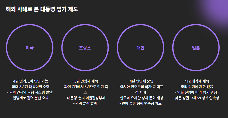 - 미국: 4년 임기, 1회 연임 가능 (최대 8년)