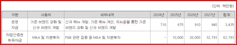 더본코리아는 이번 공모를 통해 모집된 자금을 F&B 업종 M&A 및 신규 사업에 투입할 예정입니다. 특히, 프랜차이즈 외에 유통 및 호텔 사업에 집중 투자하여 백종원 의존도를 줄이고, 다양한 수익 창출 모델을 마련하려고 합니다.