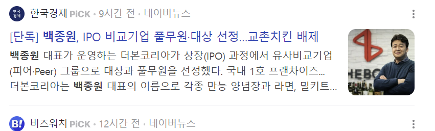 [단독] 백종원, IPO 비교기업 풀무원·대상 선정…교촌치킨 배제