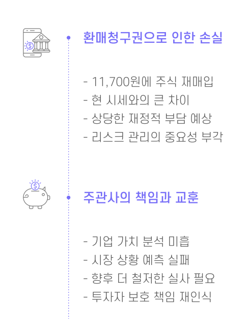 솔직히 말해, 이건 주관사 입장에서도 손해 보는 장사입니다. 데이원컴퍼니의 실적과 미래 가능성을 제대로 분석하지 못한 책임을 지는 셈이니까요. 11,700원에 주식을 되사줘야 하니 손해가 어마어마하겠죠?