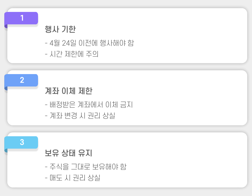 A. 배정받은 계좌에서 주식을 이동하지 않고, 4월 24일 이전까지 청구서를 제출하면 됩니다. 보통 주관사 홈페이지나 HTS를 통해 신청할 수 있어요.
