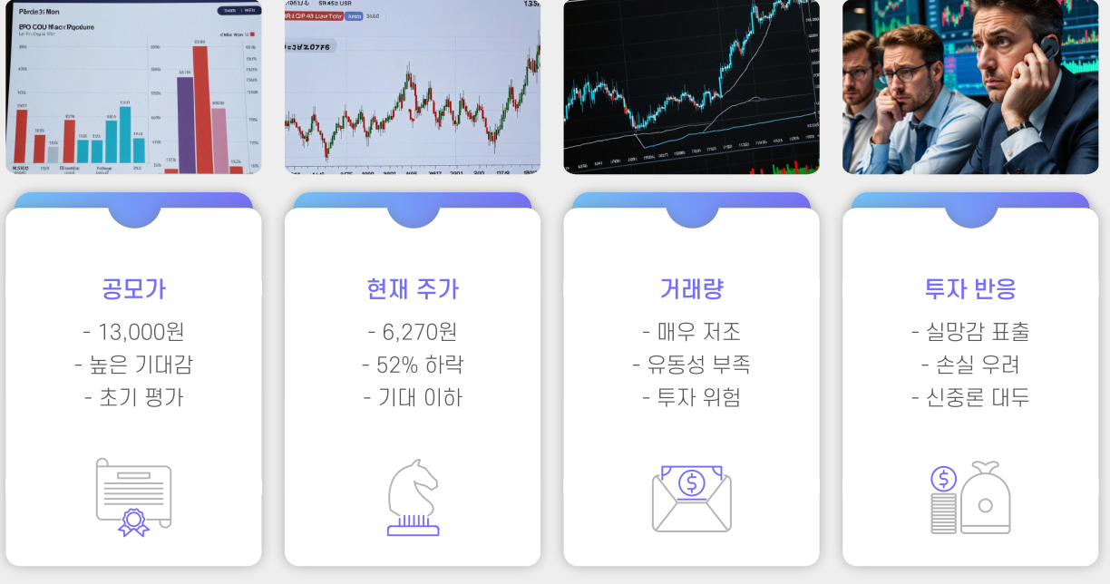 공모가가 무려 13,000원이었지만, 상장 첫날 시초가는 10,760원으로 낮게 형성됐고, 지금은 6,270원, 절반 이하로 뚝 떨어졌습니다. 주가 하락은 둘째치고 거래량이 거의 없다는 게 더 심각하죠. 이쯤 되면 "이 회사, 괜찮은 거 맞아?" 싶을 정도예요.