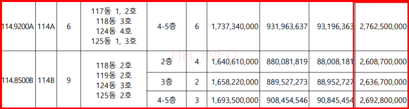 84A ~ 114A 기준으로 계약금은 3억 9,800만 원에서 5억 3,850만 원 정도이며, 중도금과 잔금을 포함한 전체 금액을 미리 준비해야 합니다.