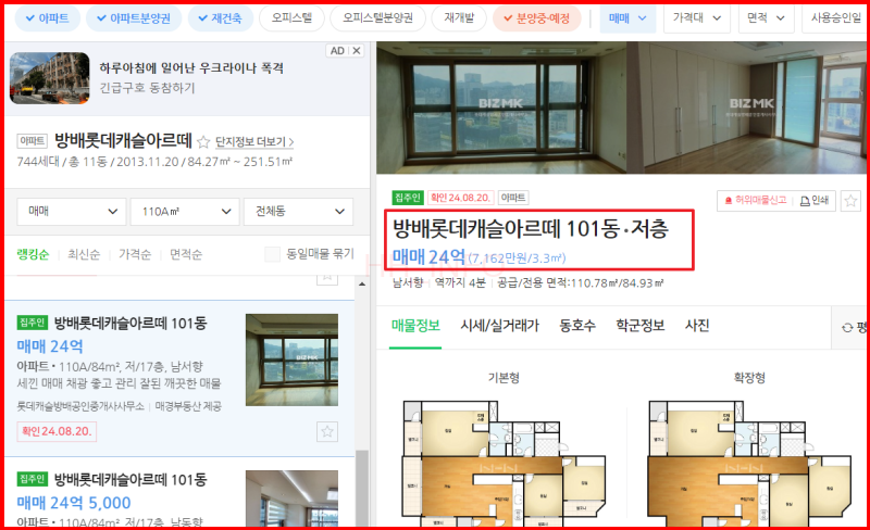 디에이치방배의 분양가는 16.57억에서 27.63억 원 사이로, 평당 6,496만 원으로 책정되었습니다. 84A 타입의 경우 분양가는 19억에서 22억 원 선, 114A와 114B 타입의 분양가는 26억에서 27억 원 선입니다. 이와 비교하여, 인근의 12년차 롯데캐슬 아파트는 84m² 저층 매물이 24억 원에 거래되고 있어, 디에이치방배의 분양가가 비교적 합리적으로 보입니다.