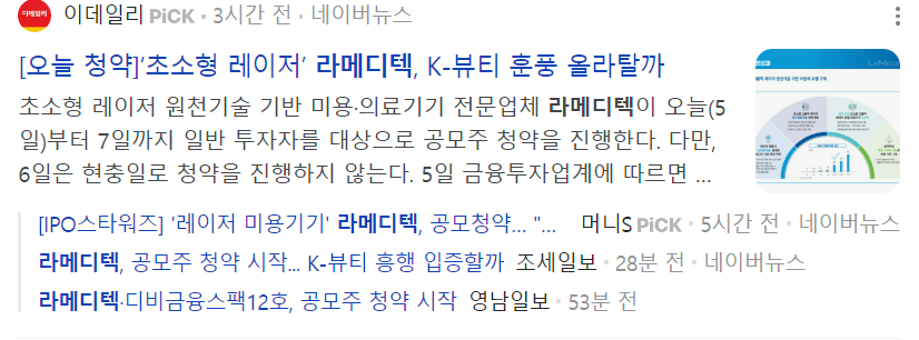 초소형 레이저 원천기술 기반 미용·의료기기 전문업체 라메디텍이 오늘(5일)부터 7일까지 일반 투자자를 대상으로 공모주 청약을 진행한다. 다만, 6일은 현충일로 청약을 진행하지 않는다. 5일