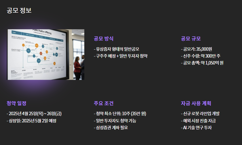 | 공모 목적 | 신규 로봇 라인업 개발, 해외 진출 자금 |