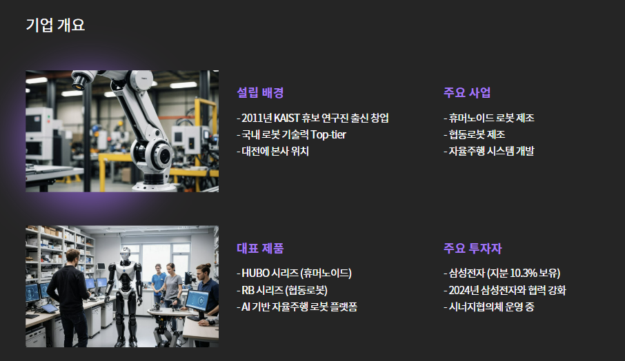 - 주요사업: 휴머노이드 로봇 및 협동로봇 제조, 자율주행 시스템