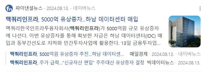 증권 > 국내증시 뉴스: 맥쿼리한국인프라투융자회사가 5000억 원 규모의 유상증자에 나선다. 이번에 확보한 자금은 하남 데이터센터(IDC) 매입과 동부간...