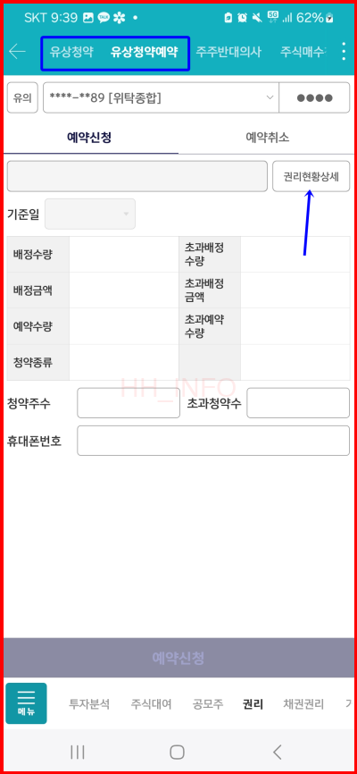 키움증권, 한국투자증권, 미래에셋 등 각 증권사에서는 청약 예약이 가능합니다. 각 증권사의 앱(MTS)을 통해 권리 항목에서 유상 청약 예약을 할 수 있으며, 해당 메뉴에서 신주인수권에 따른 배정 수량과 금액이 표시됩니다.