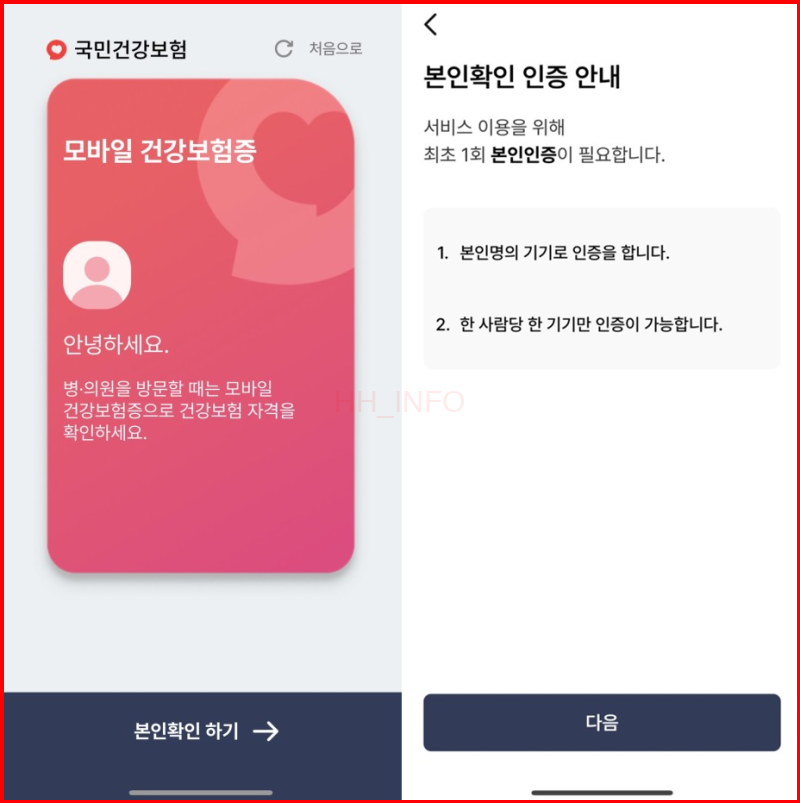 본인확인을 위해 모바일 건강보험증 앱을 다운로드하고 설치합니다. 대부분의 건강보험 앱에서 제공되며, 간단한 가입 절차를 통해 사용할 수 있습니다.