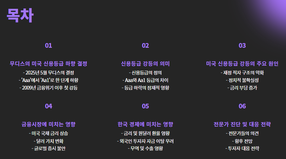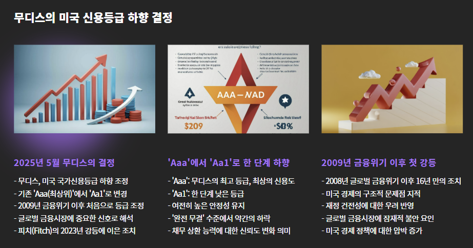 2025년 5월, 국제 신용평가사 **무디스(Moody’s)**는 미국의 국가신용등급을 기존 ‘Aaa(최상위)’에서 ‘Aa1’로 한 단계 하향 조정했습니다. 이는 무디스가 2009년 금융위기 이후 처음으로 미국 등급에 손을 댄 결정입니다.