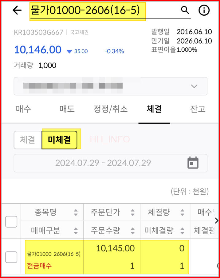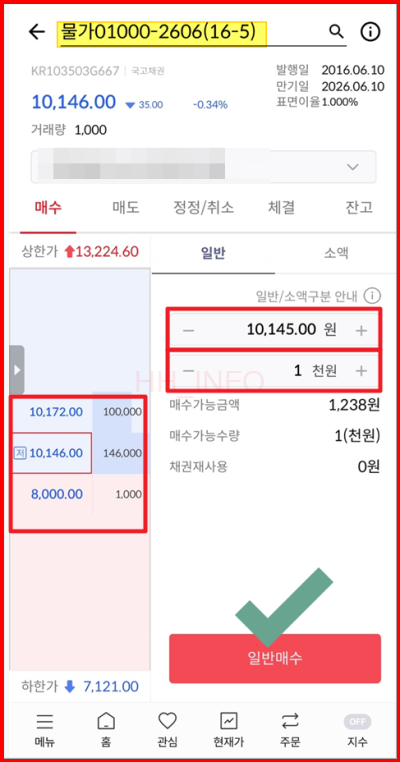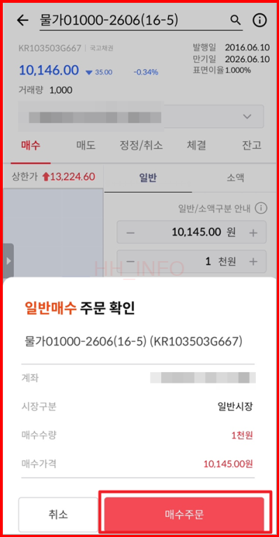 - 거래하고 싶은 물가연동국채를 선택하고 매수할 금액을 입력하여 매수 주문을 진행합니다.