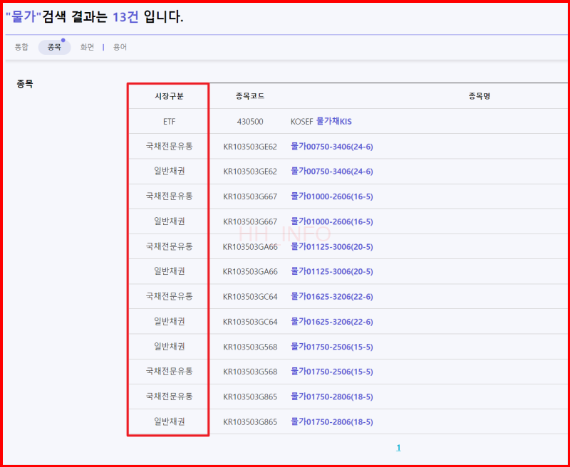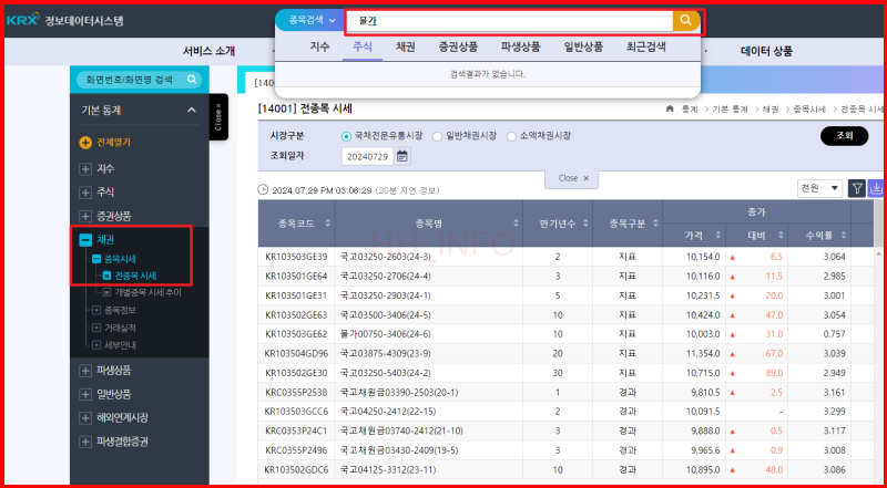 - 검색창에 '물가'를 입력하여 물가연동국채를 검색합니다.