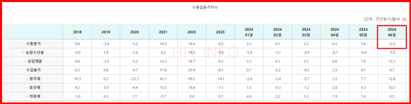 - 수출입물가지수: 최근 24년 6월 기준으로 12.2% 상승