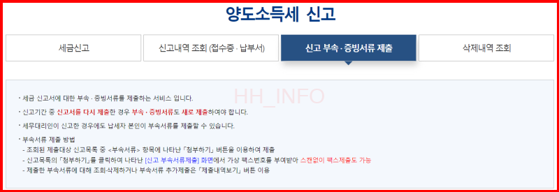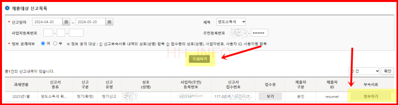 입력이 모두 완료되면 신고서를 제출합니다. 증빙서류는 상단의 신고 부속/증빙서류 제출란을 통해 첨부하면 됩니다. 증권사에서 받은 파일을 첨부하면 끝입니다.