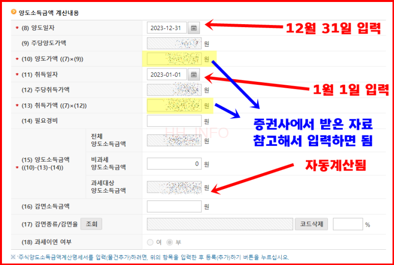 양도일자와 취득일자를 2023년 1월 1일부터 12월 31일로 기재하고, 양도가액과 취득가액을 입력하면 자동으로 주당 양도가액과 주당 취득가액이 계산됩니다.