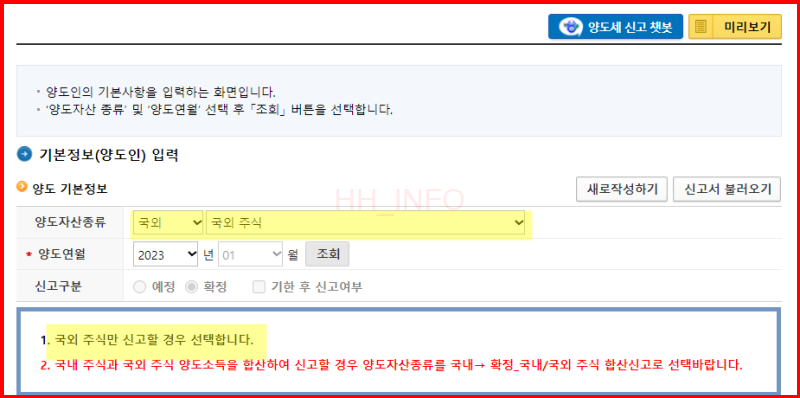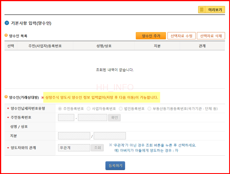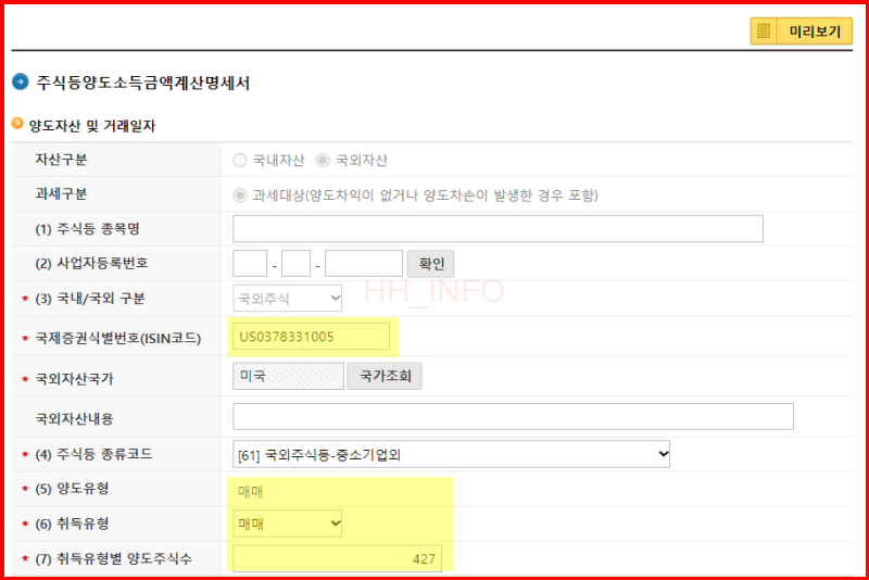 매매 횟수가 많은 경우 일일이 입력하기 어려울 수 있습니다. 이때는 국세청에서 제공하는 방법을 이용하면 됩니다. 대표적인 하나의 종목으로 등록하고, 전체 양도 주식 수를 입력하면 됩니다.