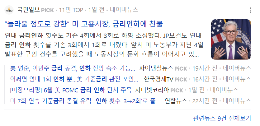 현재 미국의 금리는 5.5%예요. 전문가들은 연내 2번의 금리 인하를 예상하고 있지만, 최근 고용 지표로 인해 12월 1회 인하로 예상되는 상황이에요.