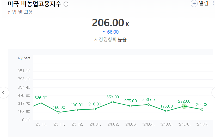 6월 비농업 일자리는 20만 6천 명 증가했지만, 직전 1년간 평균 증가 폭인 22만 명에는 미치지 못했어요. 또한 4월과 5월의 고용 지표도 각각 16만 5천 명에서 10만 8천 명, 27만 2천 명에서 21만 8천 명으로 하향 조정되었어요. 제조업 경기도 석 달 연속 위축되었으며, 지난달 제조업 PMI는 48.5로 전달보다 하락했어요.