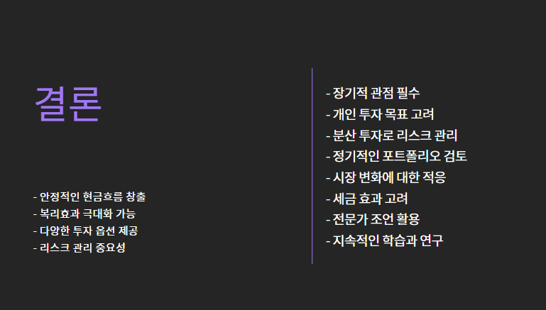 - 현금흐름의 규칙성 확보: 연금처럼 매달 들어오는 수익