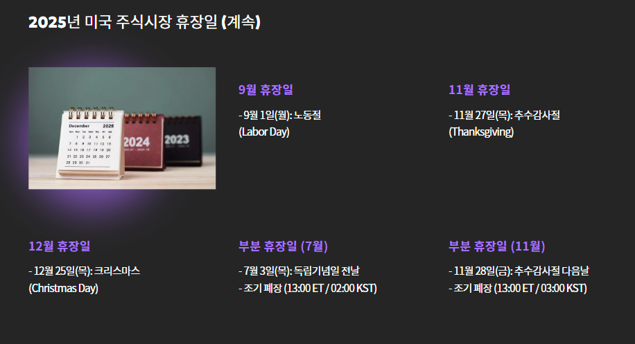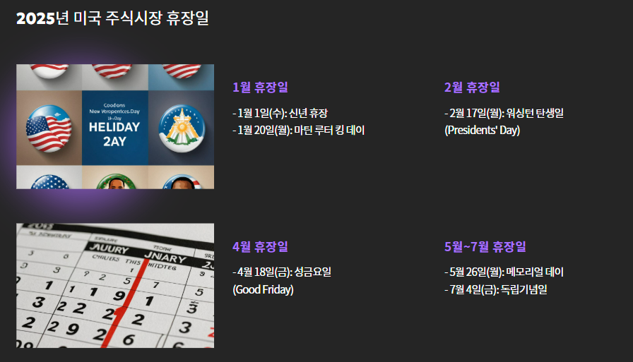 미국 공휴일에 따른 휴장일도 매년 달라지기 때문에 정확한 정보가 필요합니다.