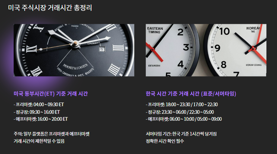 특히 시차 때문에 정규장, 프리마켓, 애프터마켓 시간은 헷갈리기 쉬우며,