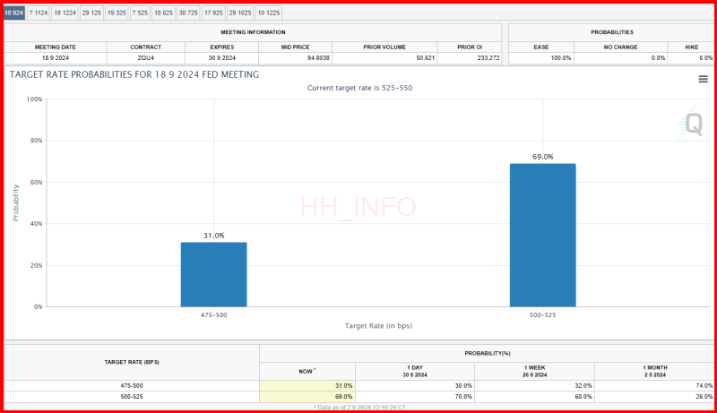 FED Watch에 따르면, 0.25% 인하 가능성은 69%, 0.5% 인하 가능성은 31%로 예상되고 있습니다. 금리 인하는 채권 투자와 밀접한 관련이 있으므로, 이번 FOMC 회의 결과에 따라 투자 전략을 재조정할 필요가 있습니다.