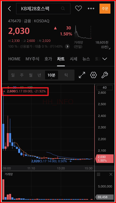 KB제28호 스팩의 경우, 1118:1의 기관경쟁률로 미래에셋비전스팩4호보다 높은 수요예측 결과가 나왔음에도 상장 당일 실적이 좋지 않았습니다. 최고가가 2,600원으로 공모가의 약 30% 상승했지만, 매도하지 못한 경우 약 1020%의 수익률이 발생합니다. 균등으로 4주만 배정받았다면, 800원1,600원의 수익인데, 청약 수수료가 1,500원이었습니다. 결론적으로 수익이 거의 없다는 것이죠. 따라서 이번 스팩 공모주 청약은 쉬어가려 합니다. 혹시나 정말 혹여나 2000원 이하로 떨어진다면, 그때 매수할 것 같습니다.