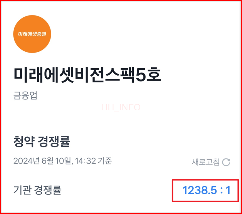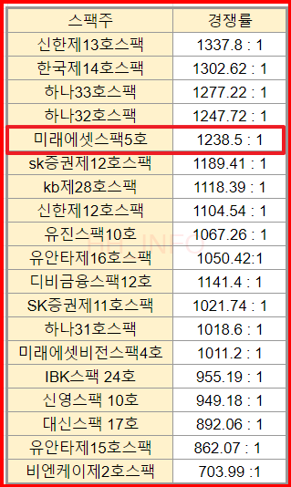 미래에셋비전스팩5호는 기관 경쟁률이 무려 1238.5:1로 나왔어요. 이는 올해 진행된 스펙주들 중 다섯 번째로 높은 결과랍니다. 참고로 함께 청약 진행 중인 한국제14호스팩보다는 조금 낮은 기관 경쟁률이에요.
