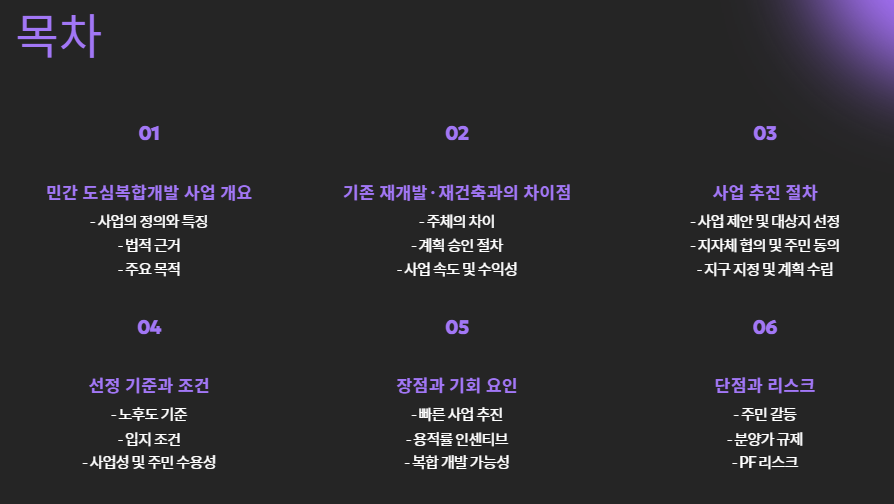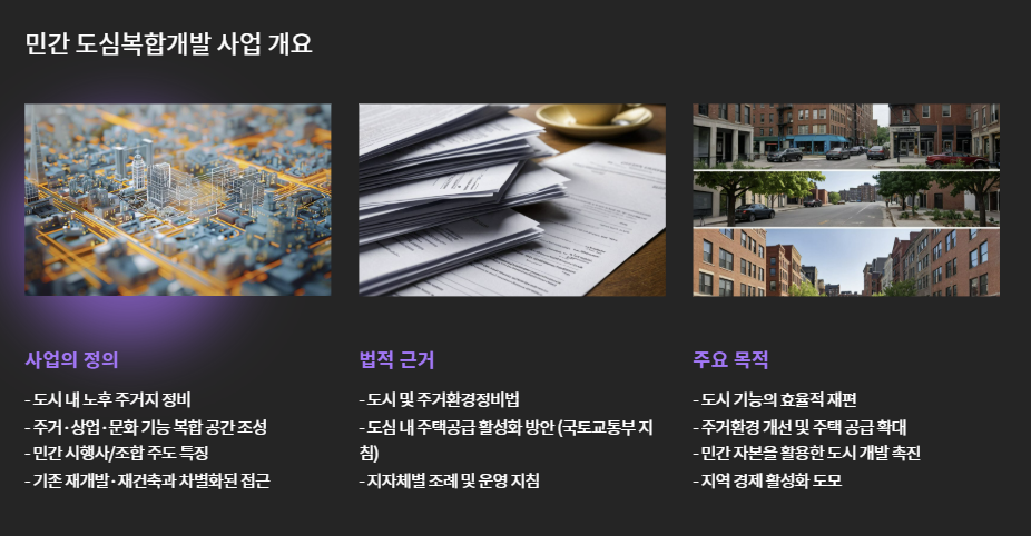 민간 도심복합개발은 말 그대로 도시 내 노후 주거지를 정비하여 주거·상업·문화 기능이 어우러진 복합 공간으로 탈바꿈시키는 개발 사업입니다.