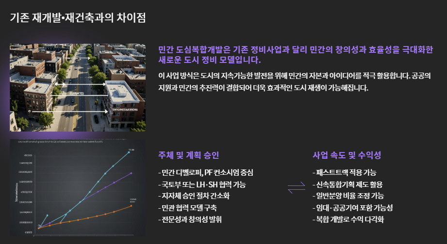기존의 재개발·재건축이 공공기관 주도였던 것에 비해, 민간 시행사나 조합이 주도적으로 계획하고 시행하는 점이 핵심 차이입니다.