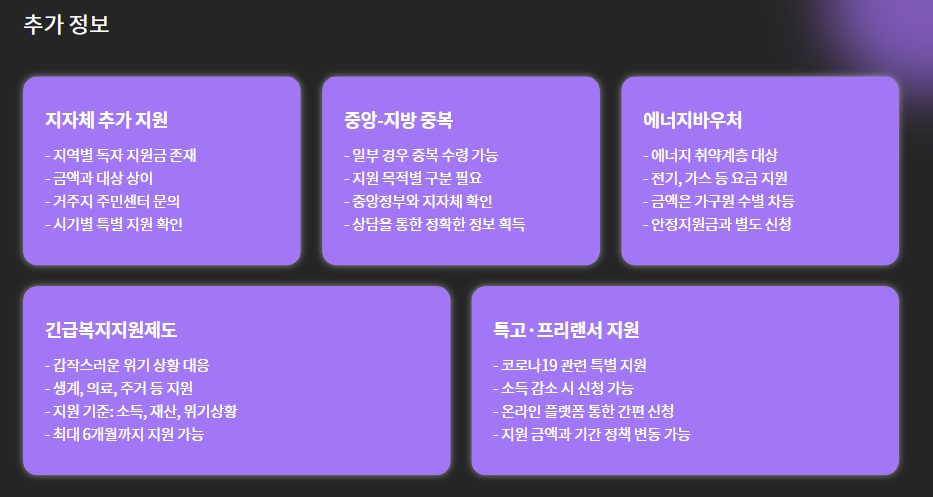 - 중복 지원 여부 체크: 다른 지원금을 이미 받고 있다면 중복 지급이 안 될 수 있으니 주의하세요.