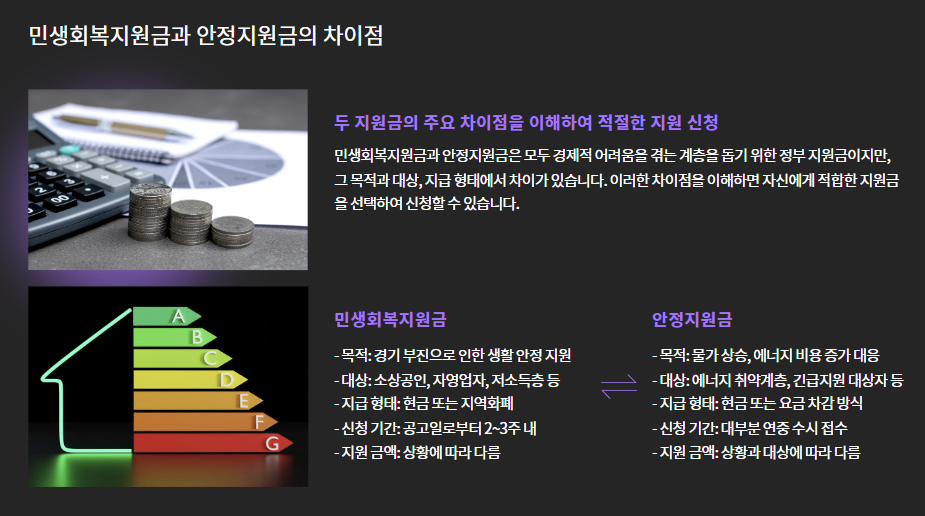 | 대상 | 소상공인, 자영업자, 저소득층 등 | 에너지 취약계층, 긴급지원 대상자 등 |