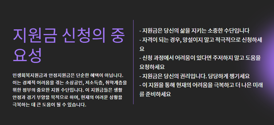 - 신청 기간 놓치지 않기: 특히 민생회복지원금은 기간이 짧습니다.