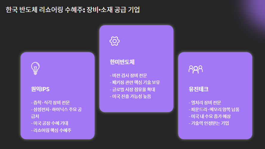 | 원익IPS | 증착·식각 장비 | 삼성전자·하이닉스에 공급, 미국 공장 수혜 기대 |
