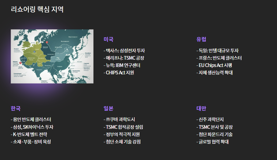 | 🇺🇸 미국 | 텍사스, 애리조나, 뉴욕 | 삼성전자, TSMC, 인텔 대규모 투자 |