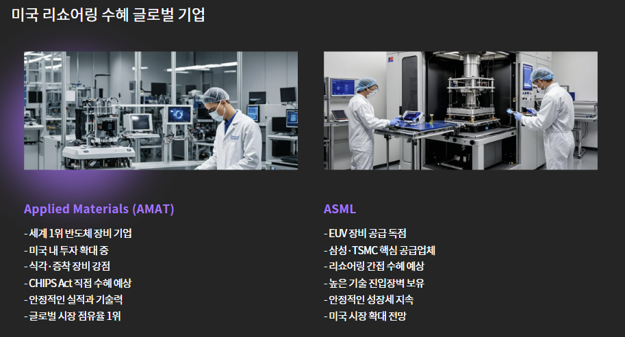 | Applied Materials (AMAT) | 🇺🇸 미국 | 세계 1위 반도체 장비 기업, 미국 투자 확대 |
