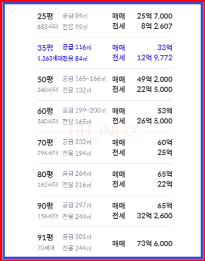 - 84㎡(전용 25평): 약 23억 원 ~ 25억 원