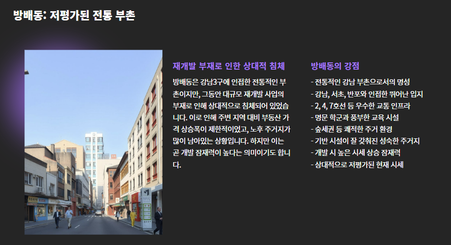 반포·대치·성수가 핫한 동안 방배동은 비교적 잠잠했습니다. 이유는 하나, 재개발의 부재였죠.