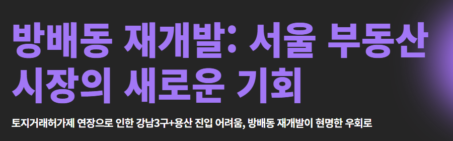 서울 부동산 시장에서 '강남3구+용산'은 불패의 땅으로 통합니다. 하지만 토지거래허가제의 연장으로 인해 아파트 진입은 현실적으로 점점 더 어려워지고 있죠. 이럴 때 필요한 건 '차선'이 아닌 '현명한 우회로', 바로 방배동 재개발입니다.