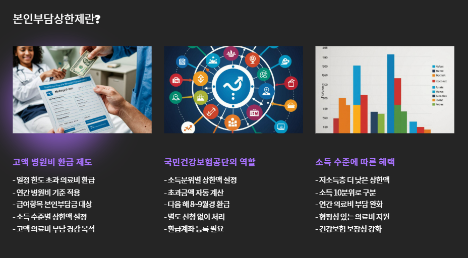 국민건강보험공단이 소득 수준에 따라 정해진 ‘본인부담 상한액’을 넘긴 병원비를 자동으로 환급해주는 구조예요.