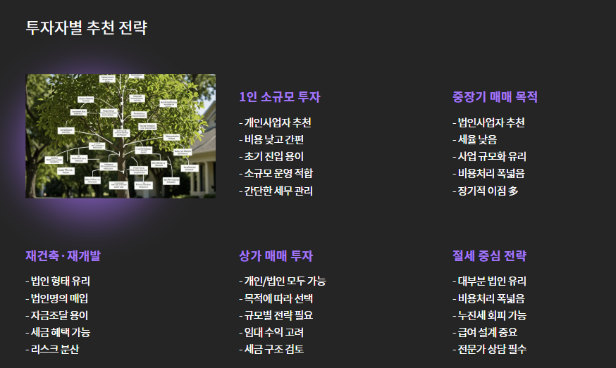 | 중장기 매매 목적 | 법인사업자 | 세율 낮고 사업 규모화 유리 |