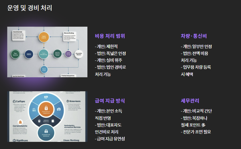 | 비용 처리 | 제한적 (실비 위주) | 법인 경비로 폭넓게 인정 |