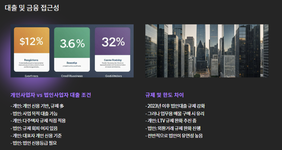 | 담보대출 | 개인 신용 기반 / 규제 多 | 사업 목적 대출로 접근 가능 |
