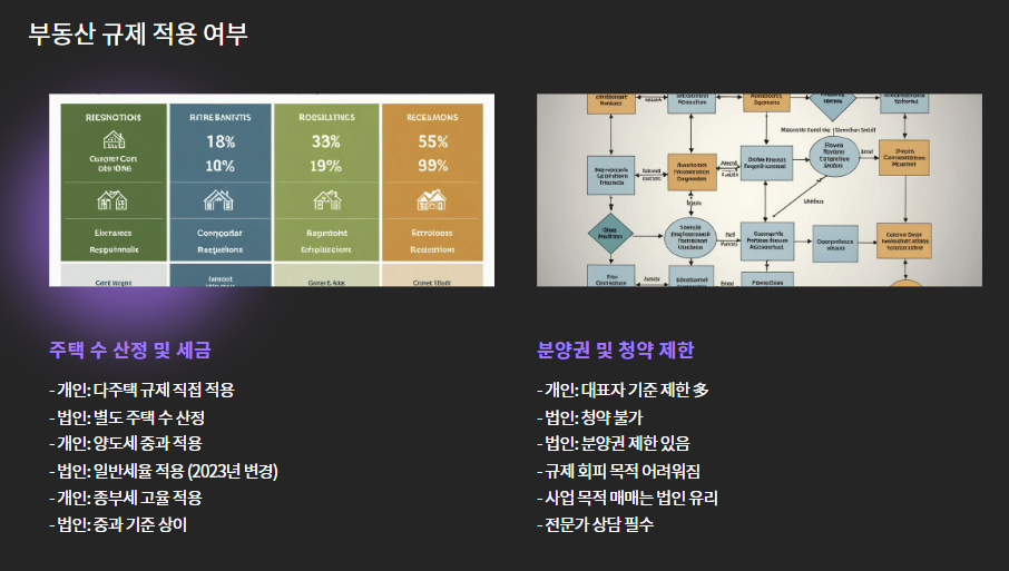 | 분양권, 청약 제한 | 대표자 기준 제한 많음 | 법인은 청약 불가, 분양권 제한 있음 |