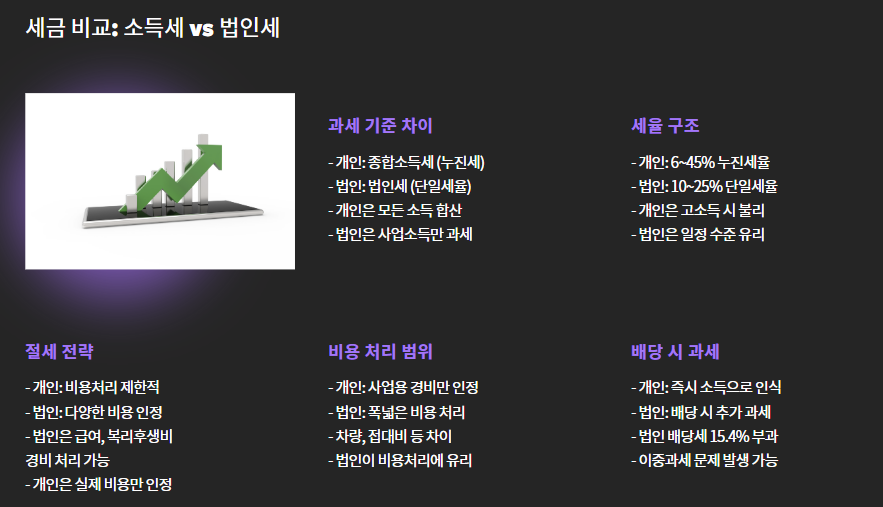 | 과세 기준 | 종합소득세 (누진세) | 법인세 (단일세율) |