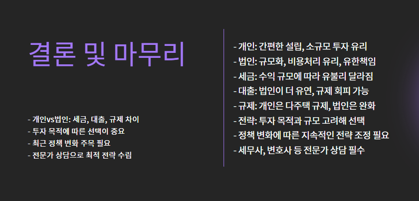 | 대출한도 | 다주택자 규제 직접 적용 | 규제 회피 여지 있음 (단, 최근 제한 강화됨) |